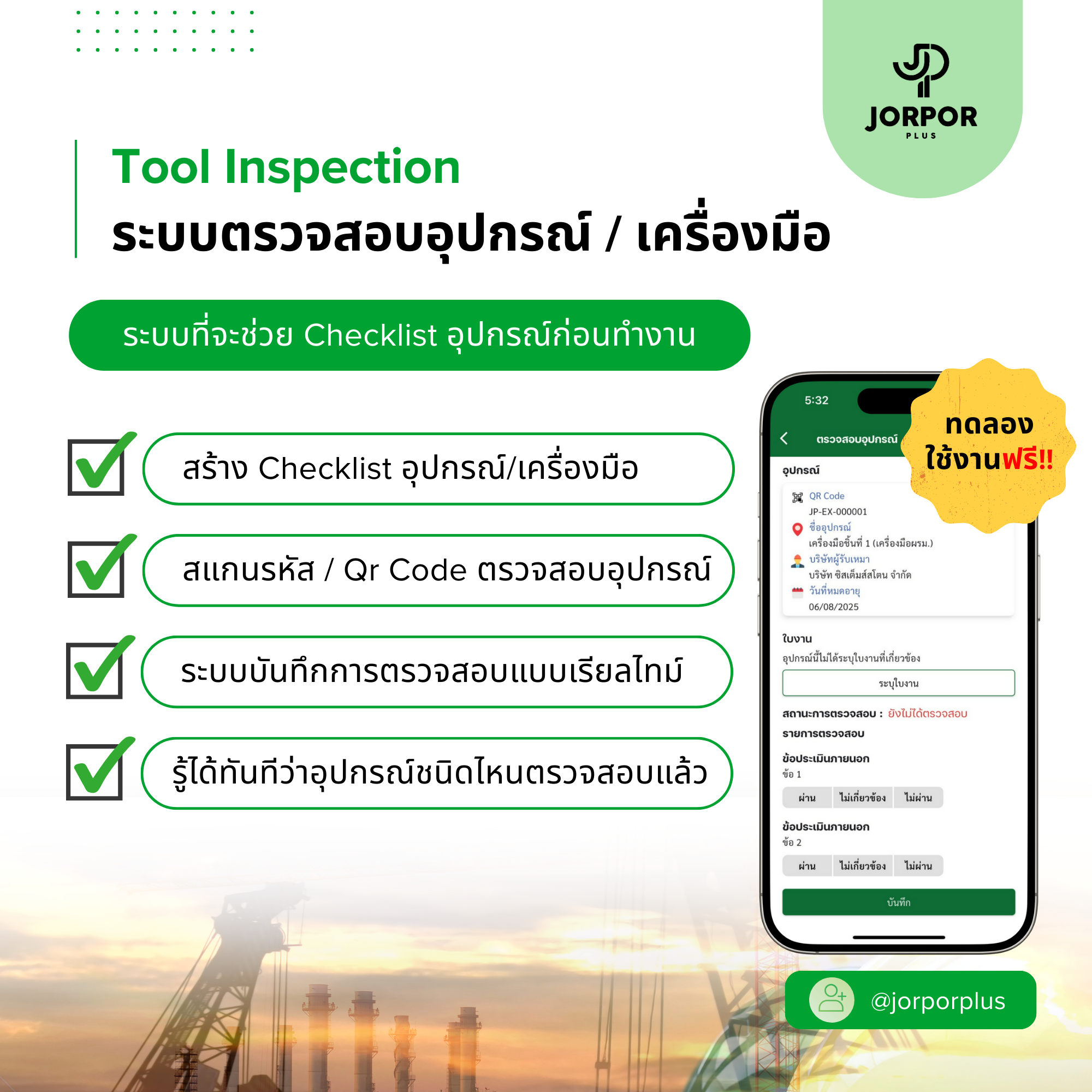 Jorpor Plus มาพร้อม ระบบ Tool Inspection ที่ช่วยทำ Checklist ตรวจสอบอุปกรณ์ก่อนทำงาน เพียงสแกน QR Code ที่ตัวอุปกรณ์ หรือกรอกรหัสอุปกรณ์ และทำการตรวจสอบอุปกรณ์ ระบบจะบันทึกการตรวจสอบทันที ทำให้เจ้าของงานหรือเจ้าหน้าที่ความปลอดภัย (จป.) รู้ได้ทันทีว่าอุปกรณ์ชนิดไหนผ่านการตรวจสอบแล้ว ระบบนี้ช่วยลดความเสี่ยงจากการใช้อุปกรณ์ชำรุด เพิ่มความปลอดภัยในการทำงาน และทำให้การจัดการอุปกรณ์ง่าย สะดวก และมีประสิทธิภาพสูงขึ้น เหมาะสำหรับทุกสถานประกอบการที่ต้องการความปลอดภัยเป็นอันดับแรก มีบริการสาธิตระบบฟรี!! และทดลองให้ใช้ฟรีแล้ววันนี้ กดคลิก ได้เลย