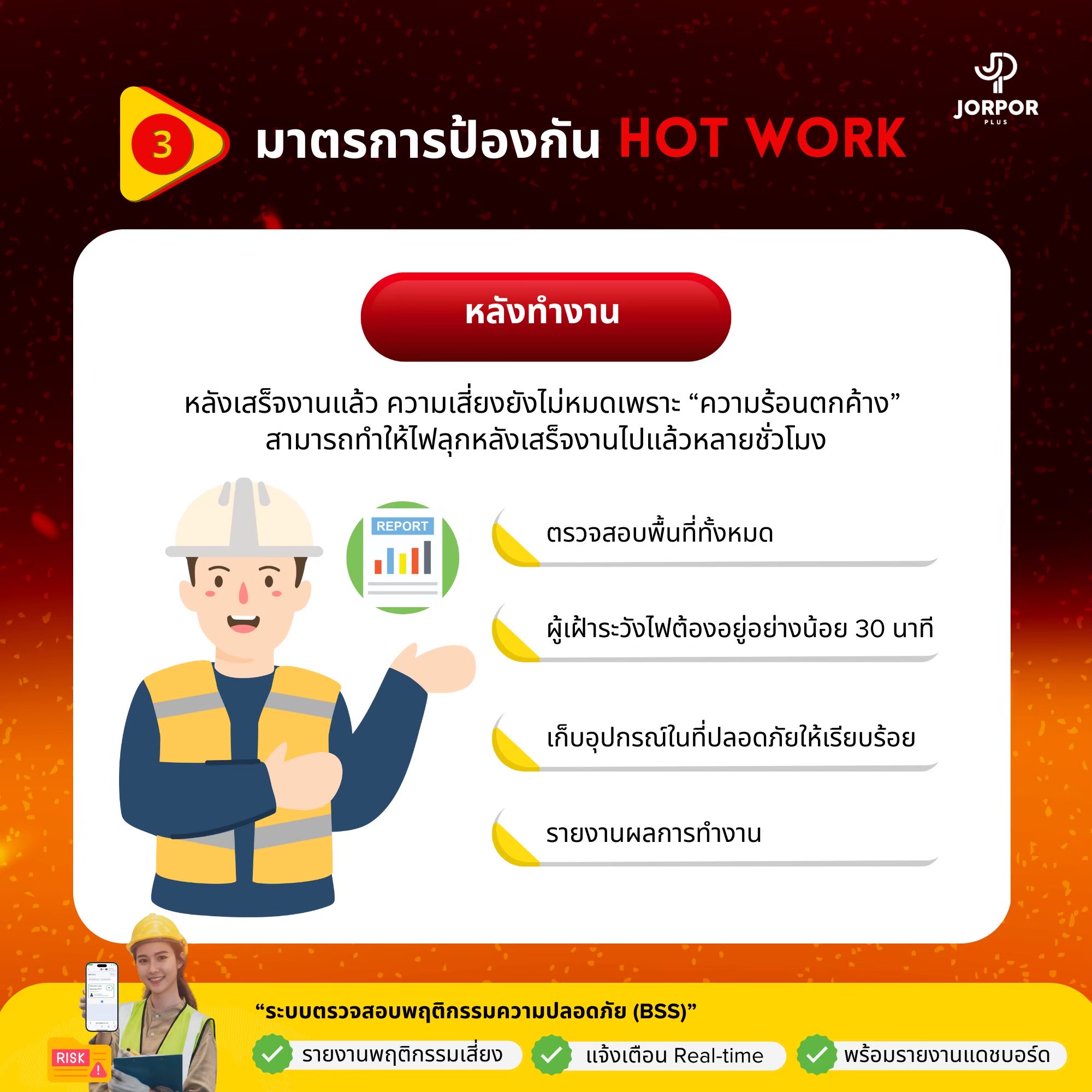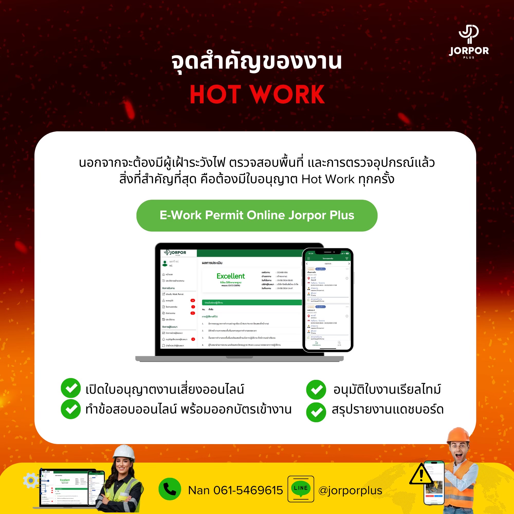 ในปัจจุบัน การจัดการความเสี่ยงสูงเหล่านี้เป็นเรื่องง่ายและรวดเร็วยิ่งขึ้น ด้วยระบบจัดการใบอนุญาตทำงานออนไลน์ Jorpor Plus ที่ช่วยให้การออก Hot Work Permit รวมถึงงานเสี่ยงอื่นๆ สามารถทำได้ผ่านโทรศัพท์มือถือ โดยมี Checklist อุปกรณ์และการประเมิน JSA ก่อนเริ่มงาน ระบบจะแจ้งเตือนและส่งคำขออนุมัติไปยังผู้เกี่ยวข้องทันที และผู้เจ้าของงาน หรือจป.สามารถประเมินงานได้ครบทั้ง 3 ระยะ (ก่อน-ระหว่าง-หลังทำงาน) ได้ในแอปพลิเคชันเดียว เพื่อยกระดับความรัดกุมและความรวดเร็วในการบริหารความปลอดภัย