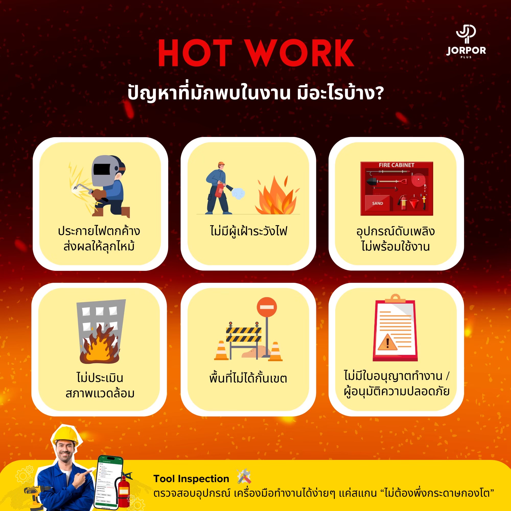 Hot Work งานที่ทำให้เกิดความร้อนหรือประกายไฟ เช่น งานเชื่อมโลหะ, งานตัดโลหะ, งานเจียร, งานบัดกรี, งานอบความร้อน, และงานเกี่ยวข้องกับเปลวไฟทุกรูปแบบ จัดเป็นงานที่มีความเสี่ยงสูงมาก ไม่ใช่แค่เพราะวัสดุไวไฟรอบตัวเท่านั้น แต่ยังรวมถึงความเสี่ยงจากควันพิษ, ไอระเหย, การไหม้ลวกจากโลหะร้อน รวมถึงอุบัติเหตุที่อาจเกิดขึ้น หากไม่มีมาตรการป้องกันอย่างเพียงพอ