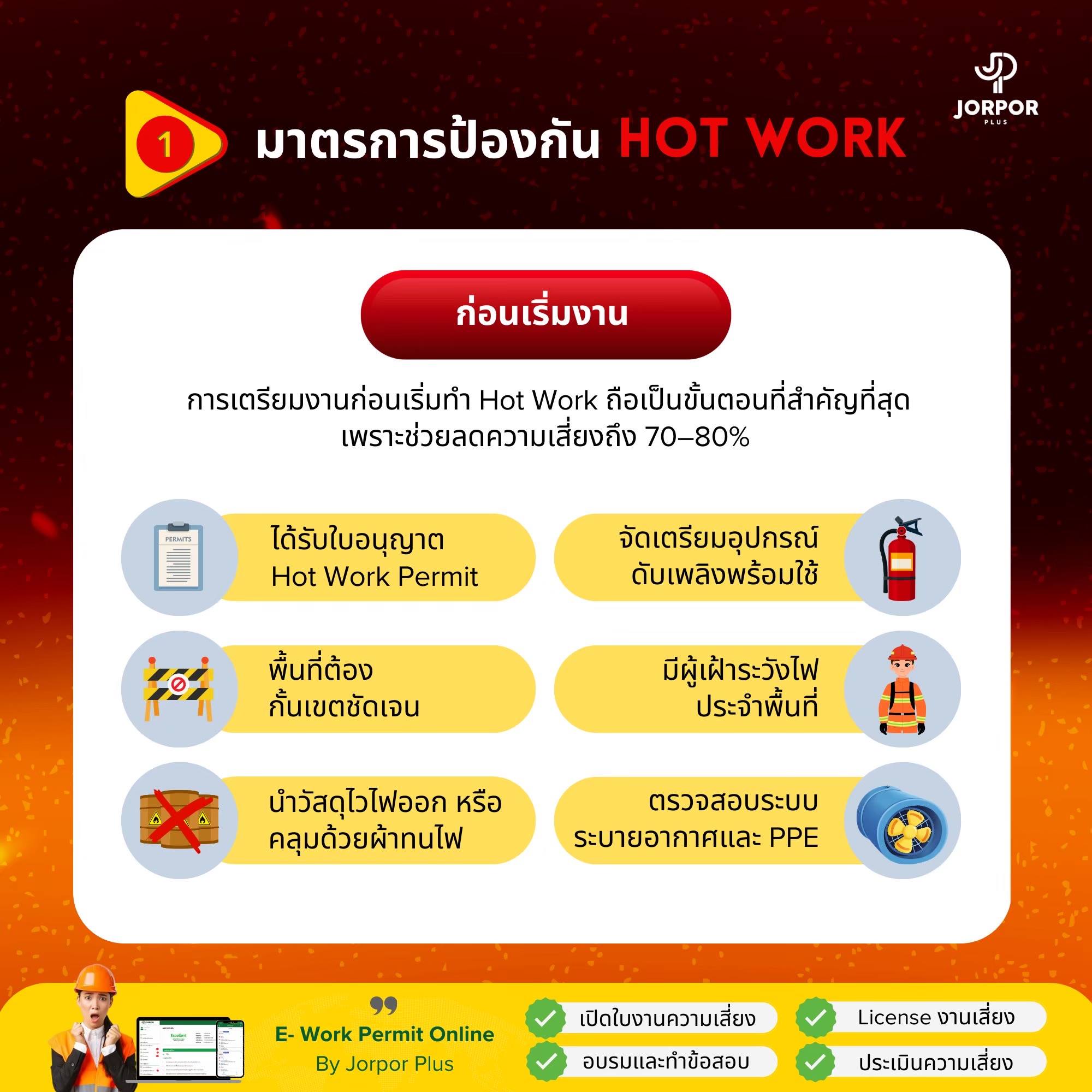 - ก่อนทำงาน: ตรวจพื้นที่ก่อนอนุญาตให้ทำงาน, ประเมินความเสี่ยงเฉพาะจุด, ตรวจอุปกรณ์ดับเพลิงก่อนใช้งาน, และตรวจ PPE