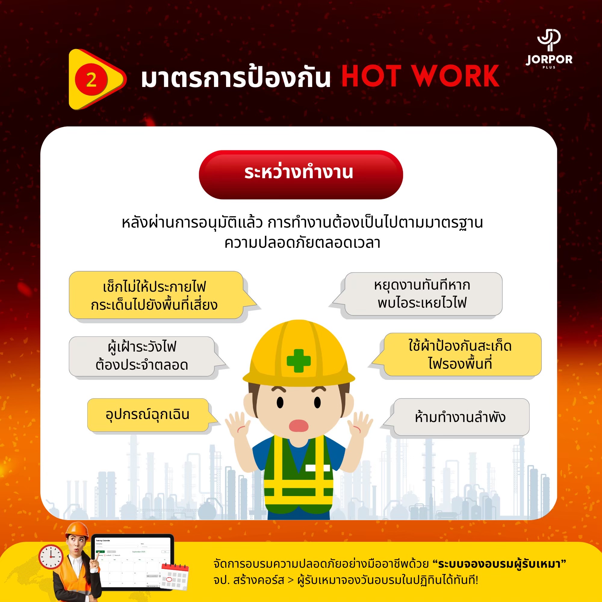 - ห้ามทำงานลำพัง: การทำงานแบบHot Work ต้องมีอย่างน้อย 2 คนเสมอ ทั้งช่างที่ทำและผู้เฝ้าระวัง เพราะหากเกิดอุบัติเหตุ คนข้างๆ ต้องช่วยได้ทันที