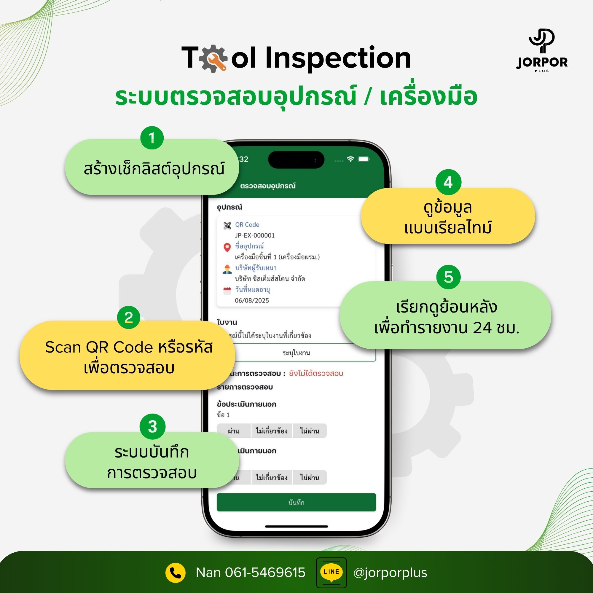 การบันทึกการตรวจสอบอุปกรณ์ เครื่องมือด้วยการสแกน QR Code หรือใส่รหัส ผูกติดกับอุปกรณ์ทุกชิ้น ระบบ Tool Inspection ของ Jorpor Plus ทำให้ จป. สามารถบันทึกผลการตรวจสอบอย่างละเอียด และเรียกดูประวัติการตรวจสอบได้ทุกเมื่อ เพื่อให้มั่นใจว่าเครื่องมือที่ถูกนำไปใช้คือเครื่องมือที่ “ปลอดภัย” และ “พร้อมใช้งาน” จริงๆ