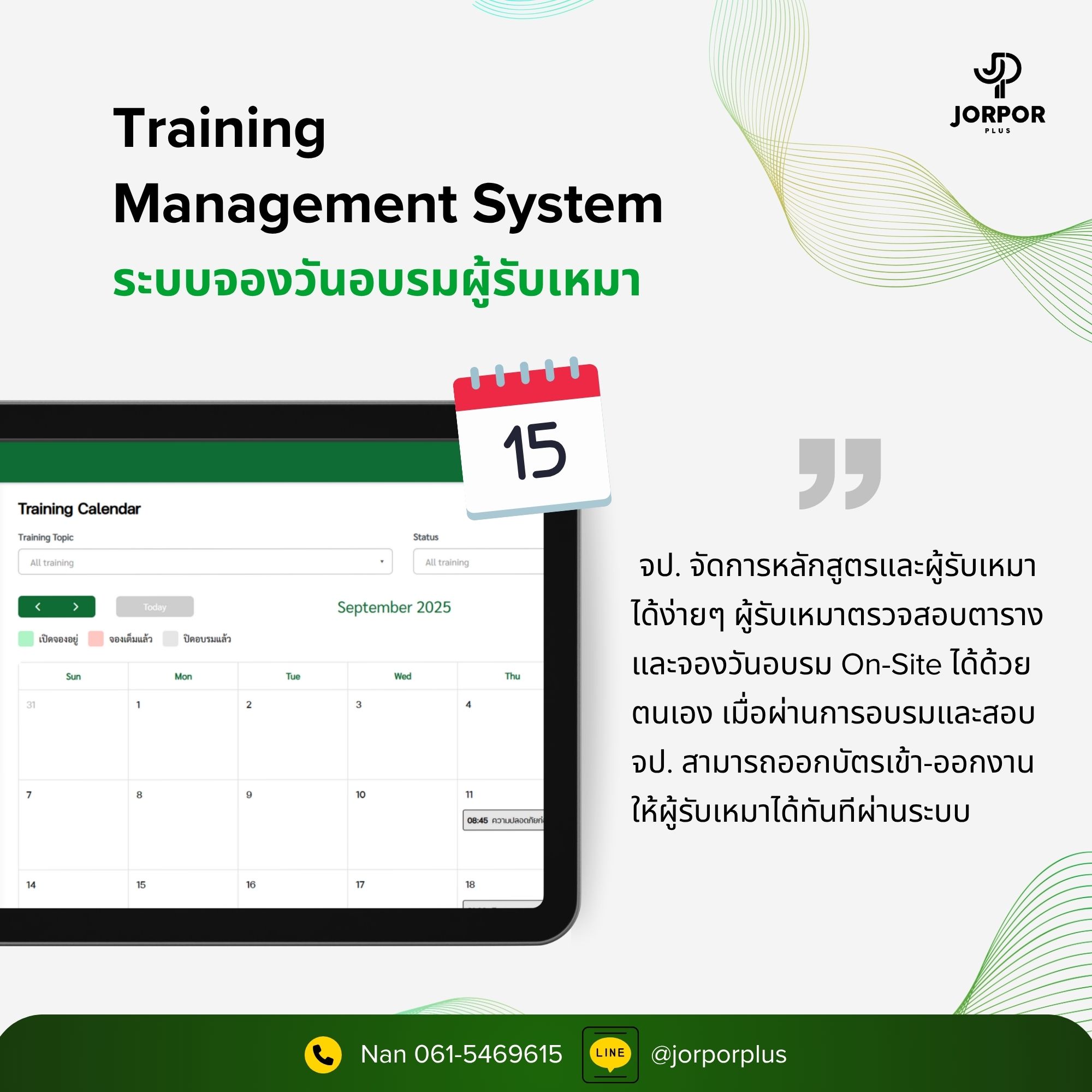 ระบบจองวันอบรม ช่วยให้การจัดการหลักสูตรและบุคลากรเป็นเรื่องง่าย ผู้รับเหมาสามารถตรวจสอบตารางและลงชื่ออบรมวันที่ต้องการได้ด้วยตนเอง และเข้าอบรมแบบ On-Site ได้ทันทีเมื่อถึงวันที่กำหนด เมื่อทำอบรมและสอบผ่าน จป.สามารถออกบัตรเข้า-ออกงานผ่านระบบได้ทันที ทำให้มั่นใจได้ว่าผู้ปฏิบัติงานทุกคนมีคุณสมบัติที่ถูกต้องตามกฎหมาย