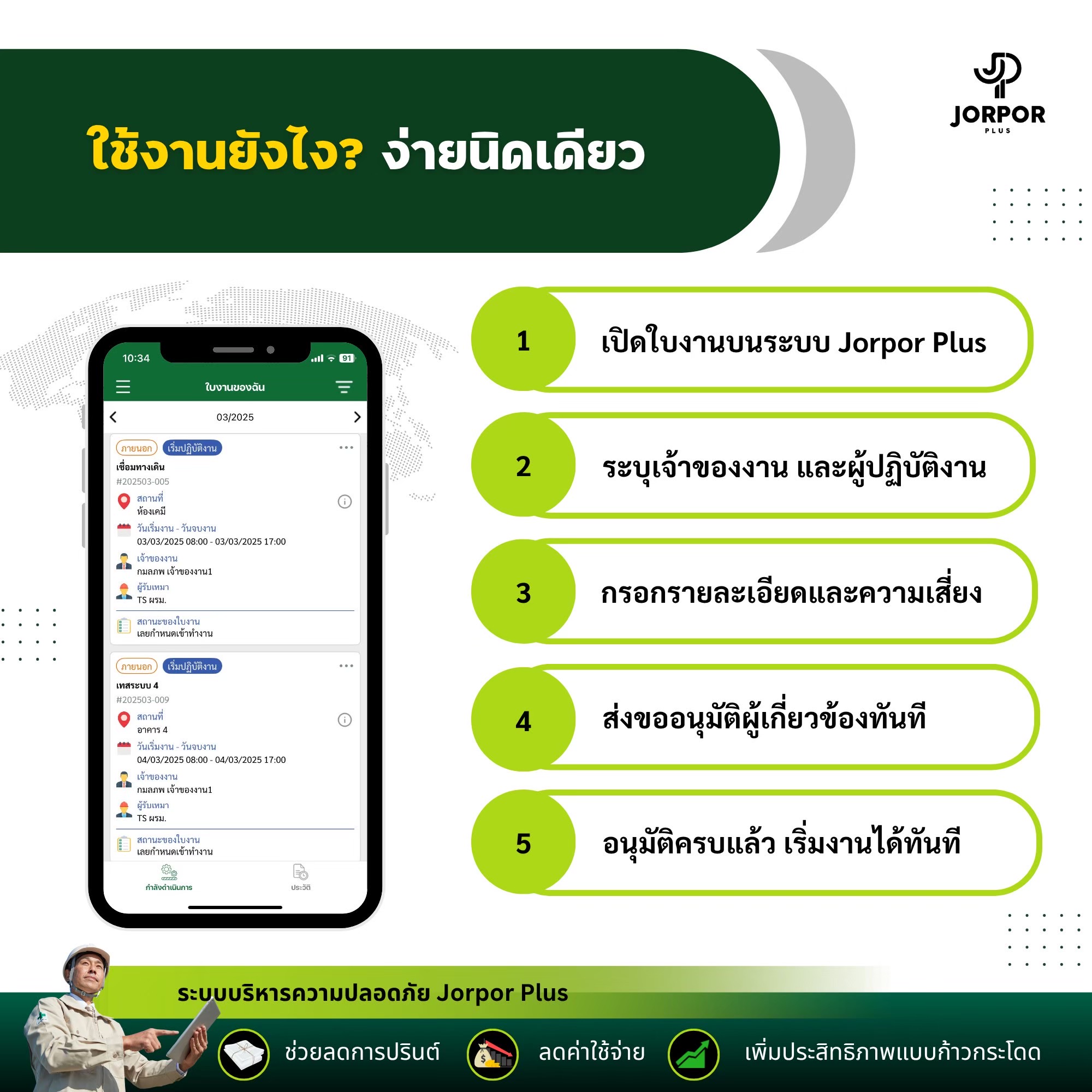ไม่ว่าคุณจะเป็น ช่างประจำ หรือ ช่างรับเหมา ถ้าคุณต้องเจองานซ่อมบำรุงที่ต้องทำแบบเร่งด่วนทุกวัน อย่าปล่อยให้เอกสารขัดขวางงาน! ลองใช้ ระบบจัดการใบอนุญาตเข้าทำงาน (EWS) ออนไลน์ ของ Jorpor Plus แล้วคุณจะรู้ว่า “ขออนุญาตไว = ซ่อมไว ปลอดภัยกว่า” มีทดลองให้ใช้แล้ว กดคลิก ได้เลย