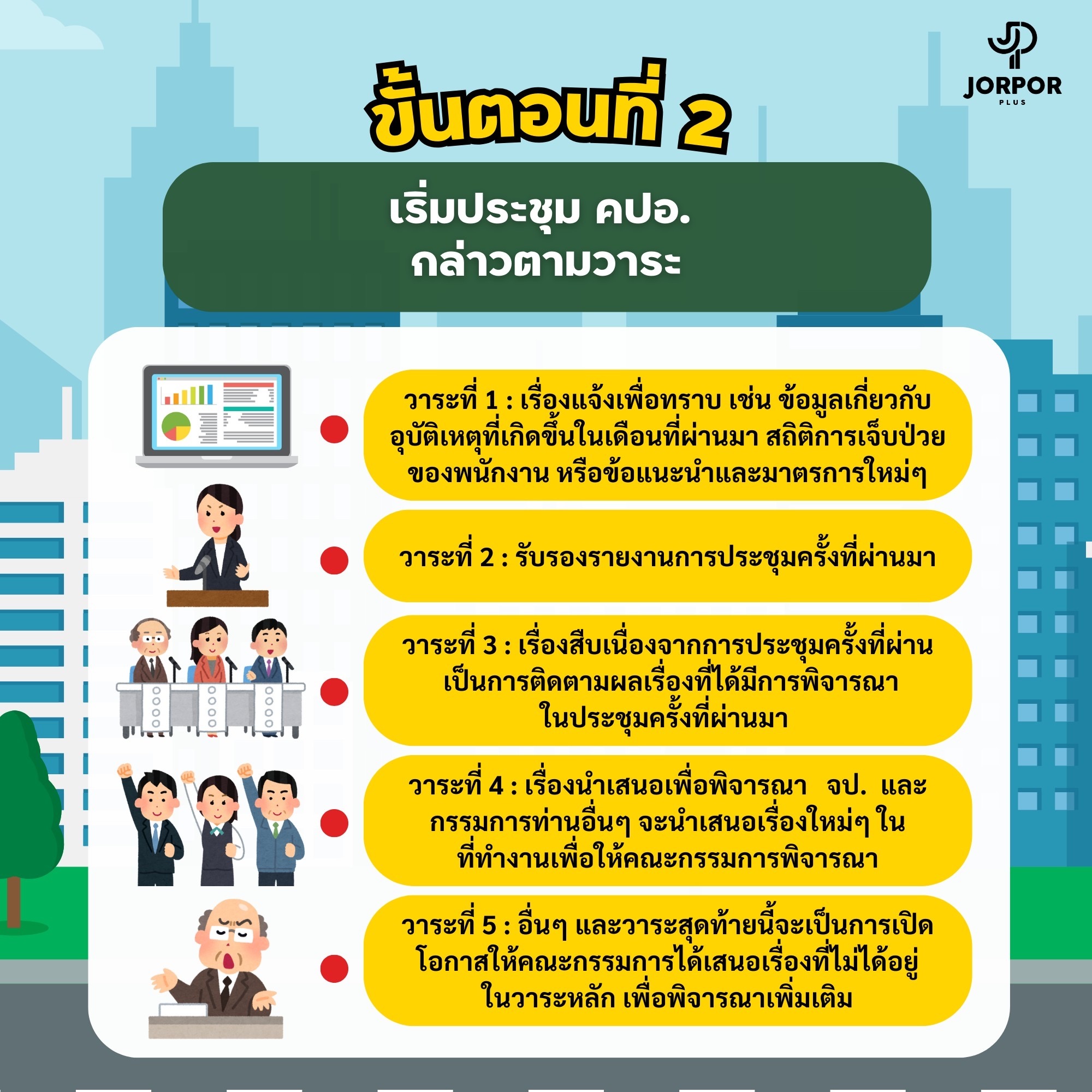 - วาระที่ 5 : อื่นๆ วาระสุดท้ายนี้จะเป็นการเปิดโอกาสให้คณะกรรมการได้เสนอเรื่องที่ไม่ได้อยู่ในวาระหลัก เพื่อพิจารณาเพิ่มเติม หรือเสนอความคิดเห็นและข้อเสนอแนะต่างๆ ที่อาจเป็นประโยชน์ในการปรับปรุงการจัดการด้านความปลอดภัยในที่ทำงาน