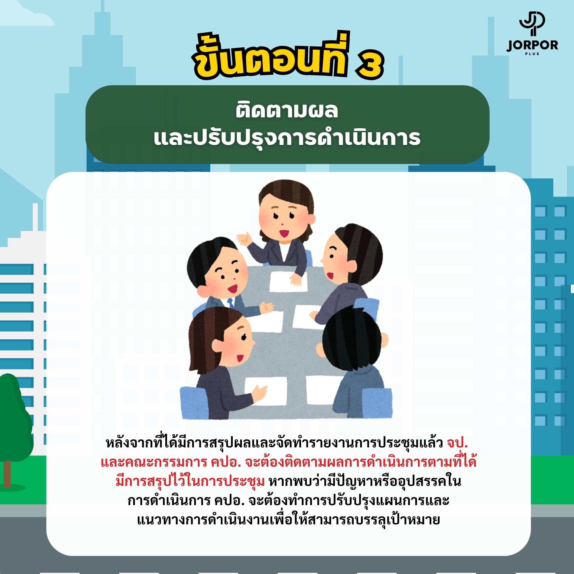 - ติดตามผล : หลังจากที่ได้มีการสรุปผลและจัดทำรายงานการประชุมแล้ว จป.วิชาชีพและคณะกรรมการคปอ. จะต้องติดตามผลการดำเนินการตามที่ได้มีการสรุปไว้ในการประชุม หากพบว่ามีปัญหาหรืออุปสรรคในการดำเนินการคปอ. จะต้องทำการปรับปรุงแผนการและแนวทางการดำเนินงานเพื่อให้สามารถบรรลุเป้าหมายด้านความปลอดภัยและสุขภาพในที่ทำงานได้อย่างมีประสิทธิภาพ