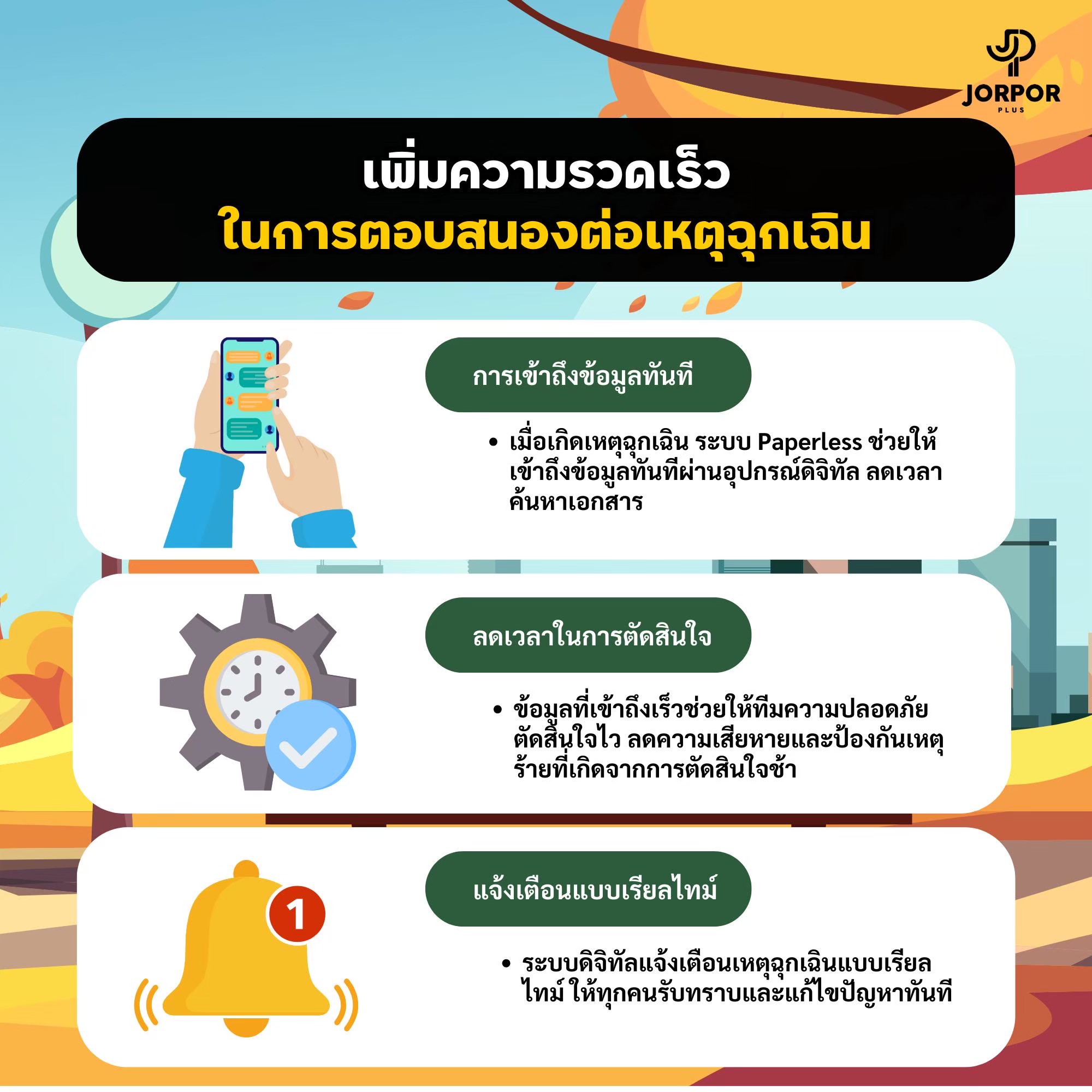 การลดการใช้กระดาษในองค์กรไม่เพียงแต่ช่วยลดผลกระทบต่อสิ่งแวดล้อม แต่ยังช่วยเพิ่มประสิทธิภาพในการทำงาน ลดต้นทุน และเพิ่มความปลอดภัยในการเก็บรักษาข้อมูล เทคโนโลยีดิจิทัลเป็นเครื่องมือที่สำคัญในการจัดการเอกสารและข้อมูลต่างๆ ซึ่ง Jorpor Plus ก็เป็นตัวอย่างหนึ่งที่สามารถช่วยองค์กรลดการใช้กระดาษและทำให้การจัดการงานความปลอดภัยเป็นไปได้อย่างมีประสิทธิภาพและยั่งยืน มีทดลองให้ใช้แล้ว กดคลิก ได้เลย