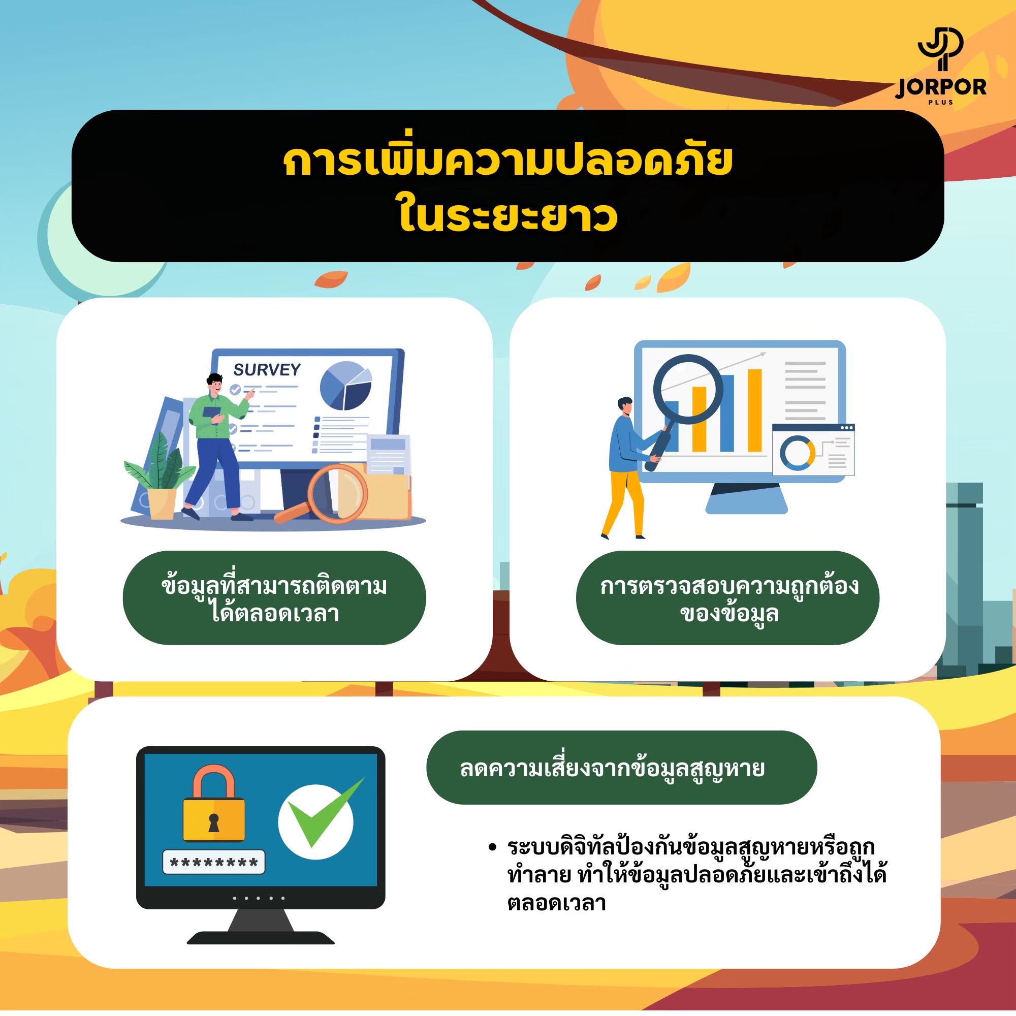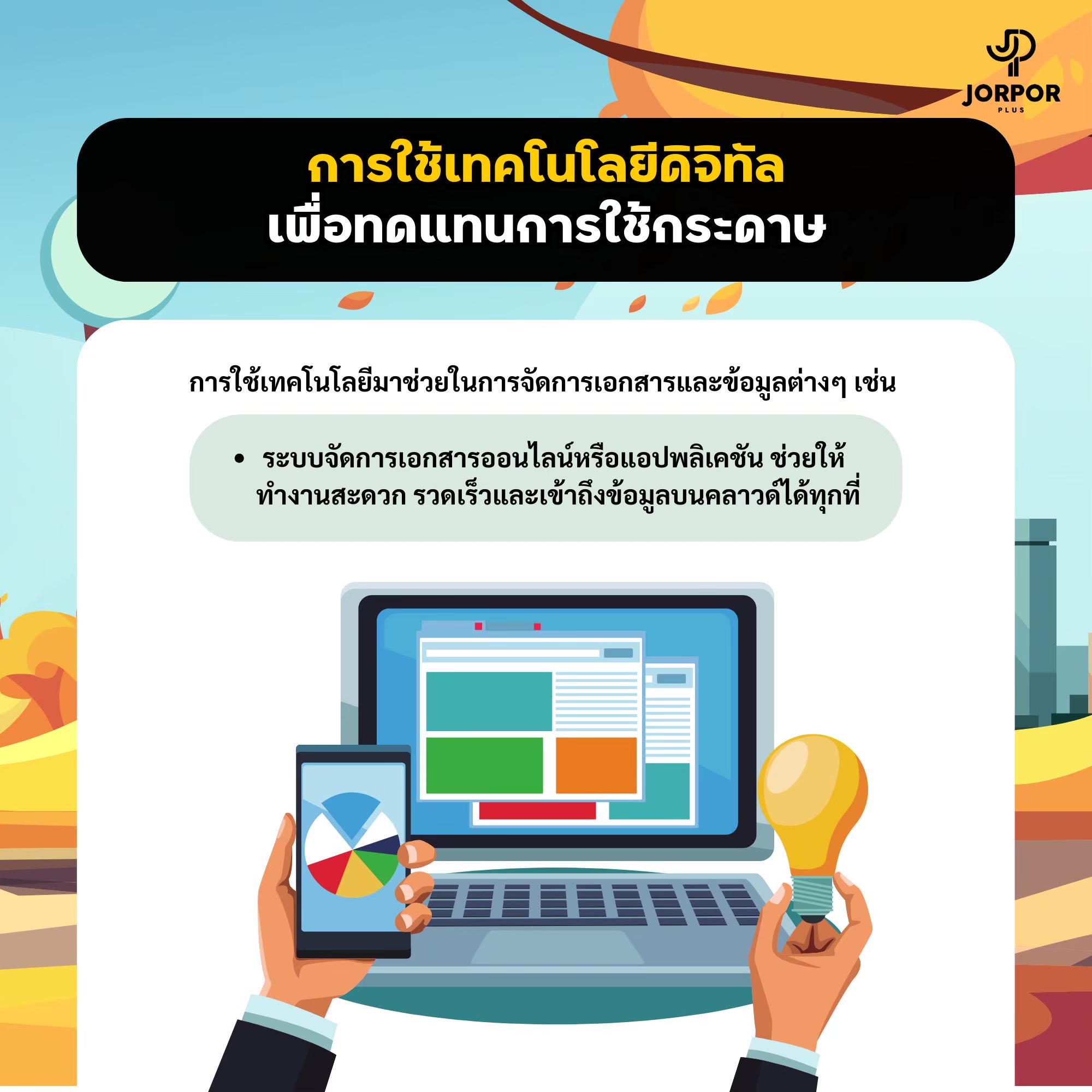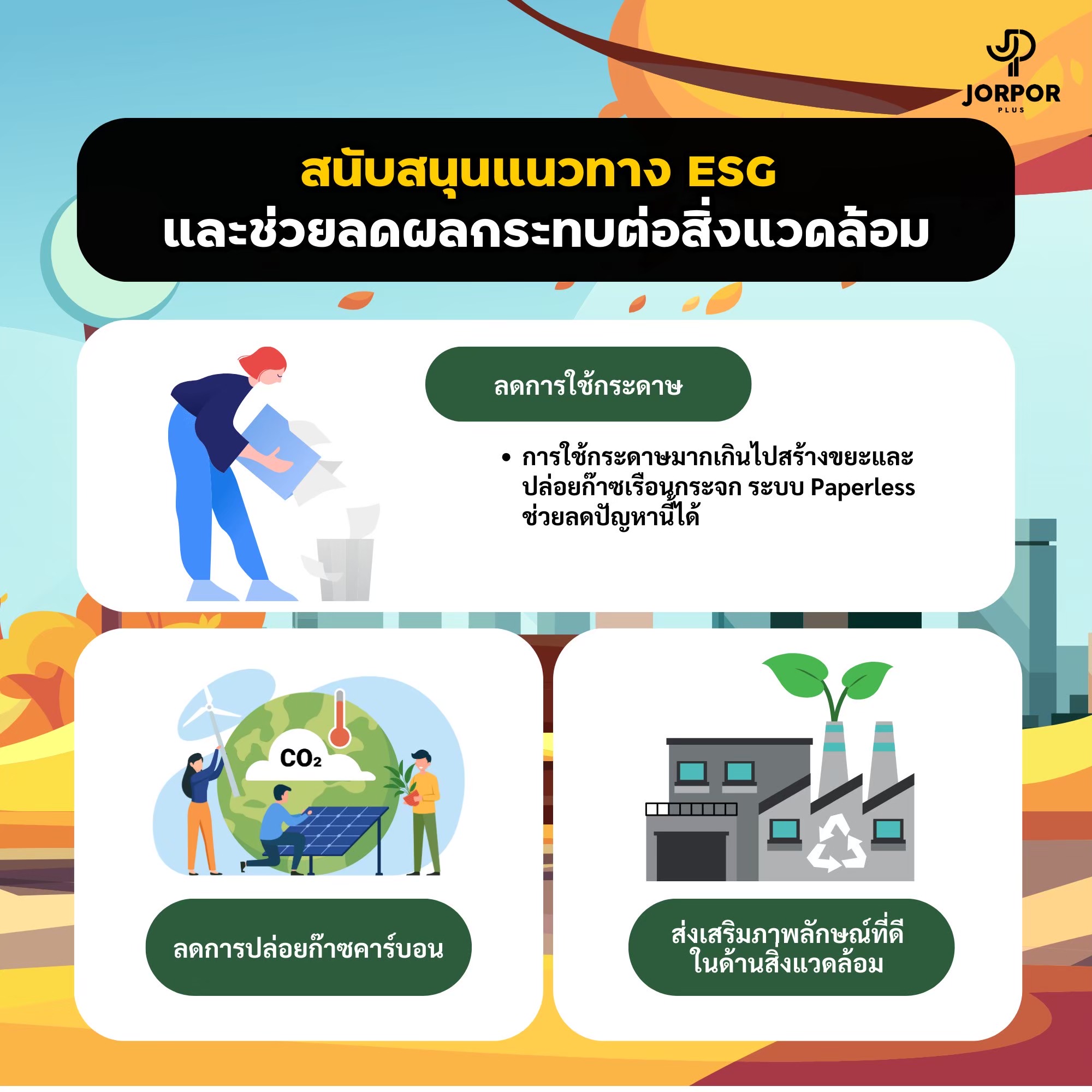 การลดการใช้กระดาษใน Jorpor Plus ยังสนับสนุนการทำงานในองค์กรที่ยั่งยืน และช่วยลดต้นทุนที่เกิดจากการใช้กระดาษ ทำให้การดำเนินงานในทุกๆ ด้านมีความสะดวก รวดเร็ว และปลอดภัยยิ่งขึ้น นอกจากนี้ การใช้ระบบดิจิทัลยังช่วยให้สามารถตรวจสอบสถานะต่างๆ ได้ในเวลาจริง ลดความผิดพลาดจากข้อมูลที่อาจสูญหายหรือถูกทำลายจากการใช้งานกระดาษ