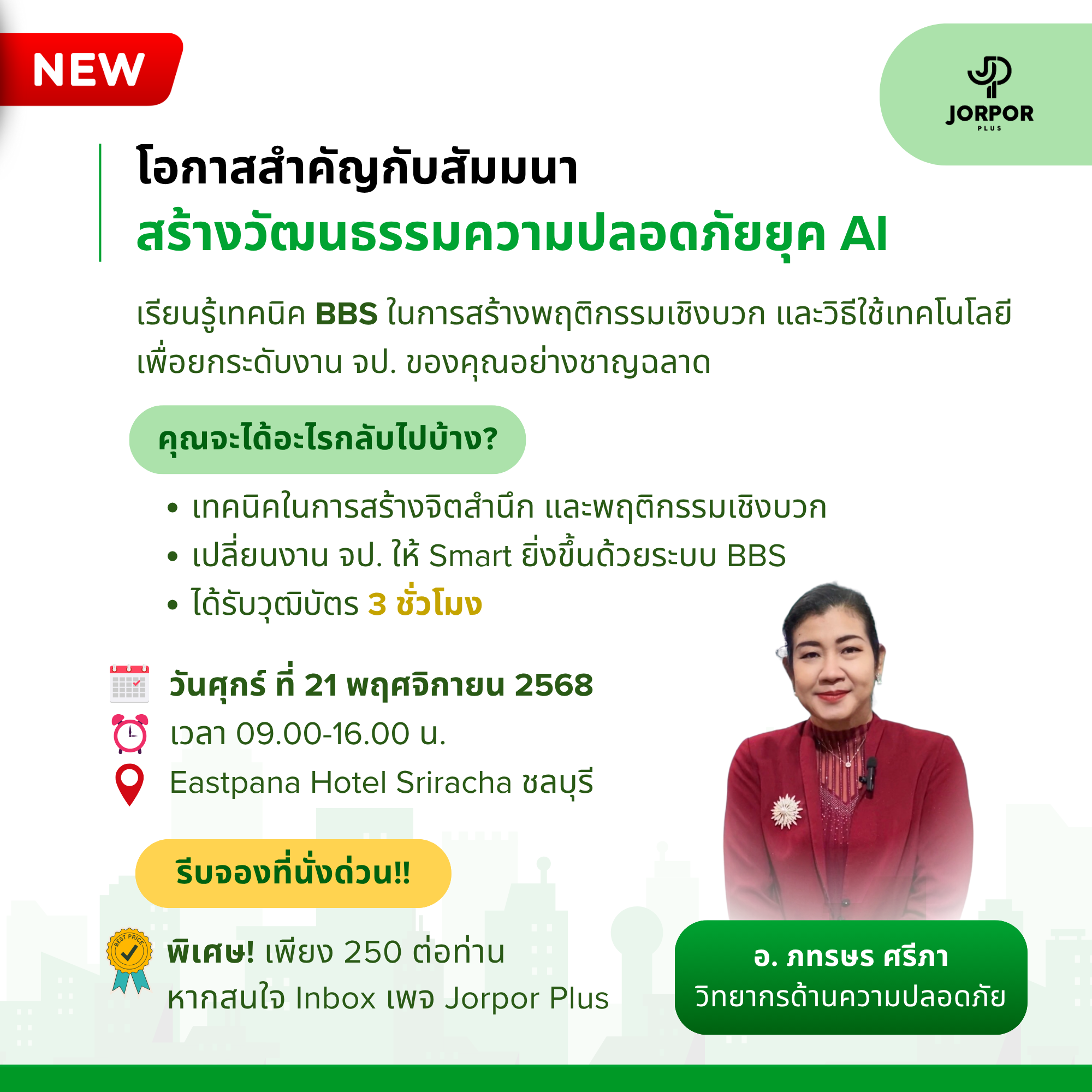 หากคุณต้องการเรียนรู้เทคนิค Behavior-Based Safety ในการสร้างพฤติกรรมเชิงบวก และวิธีใช้เทคโนโลยีเพื่อยกระดับงาน จป. ของคุณอย่างชาญฉลาด ขอเชิญเข้าร่วมงานสัมมนาครั้งสำคัญ