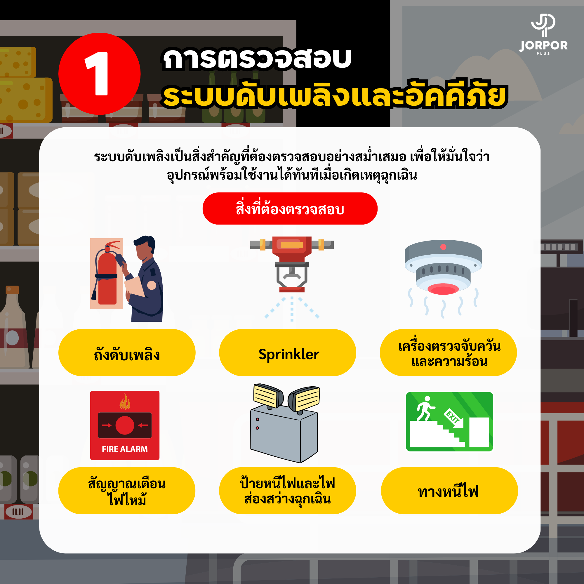 - ถังดับเพลิง : ตรวจสอบแรงดัน น้ำยา และวันหมดอายุ