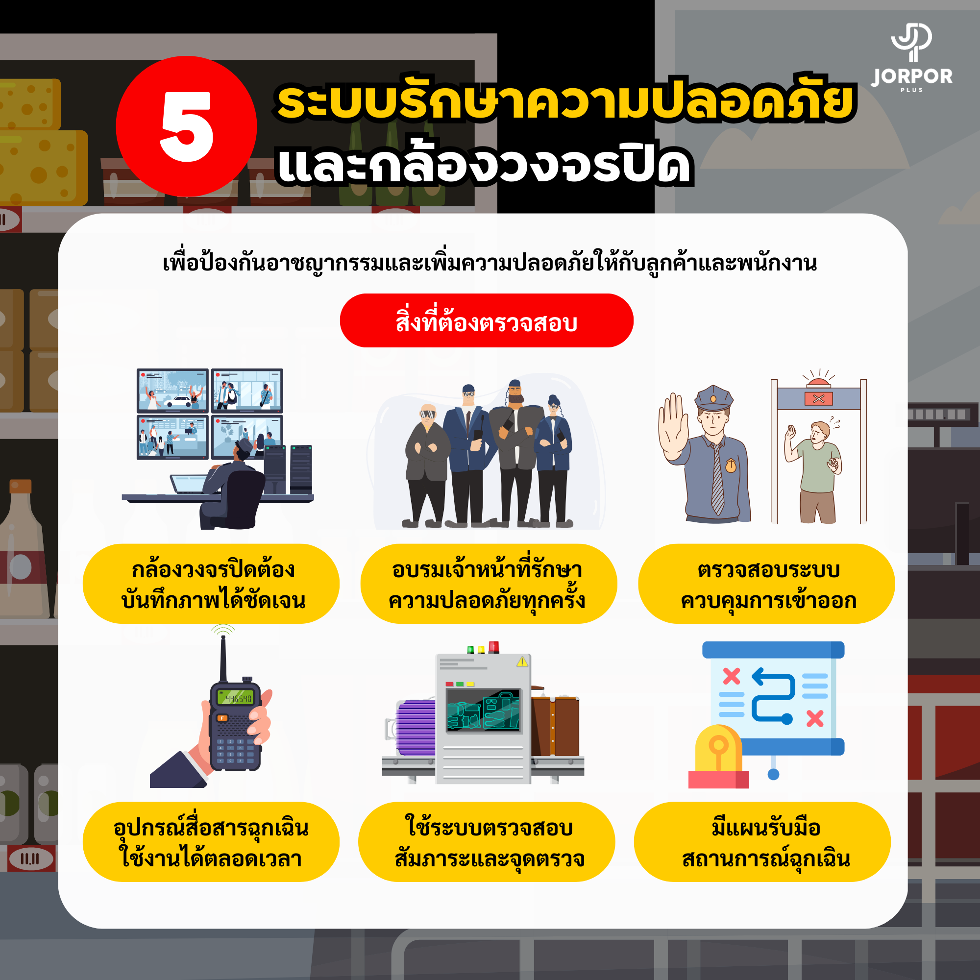 - กล้องวงจรปิด (CCTV) : ต้องสามารถบันทึกภาพได้ชัดเจนและครอบคลุมทุกจุดสำคัญ