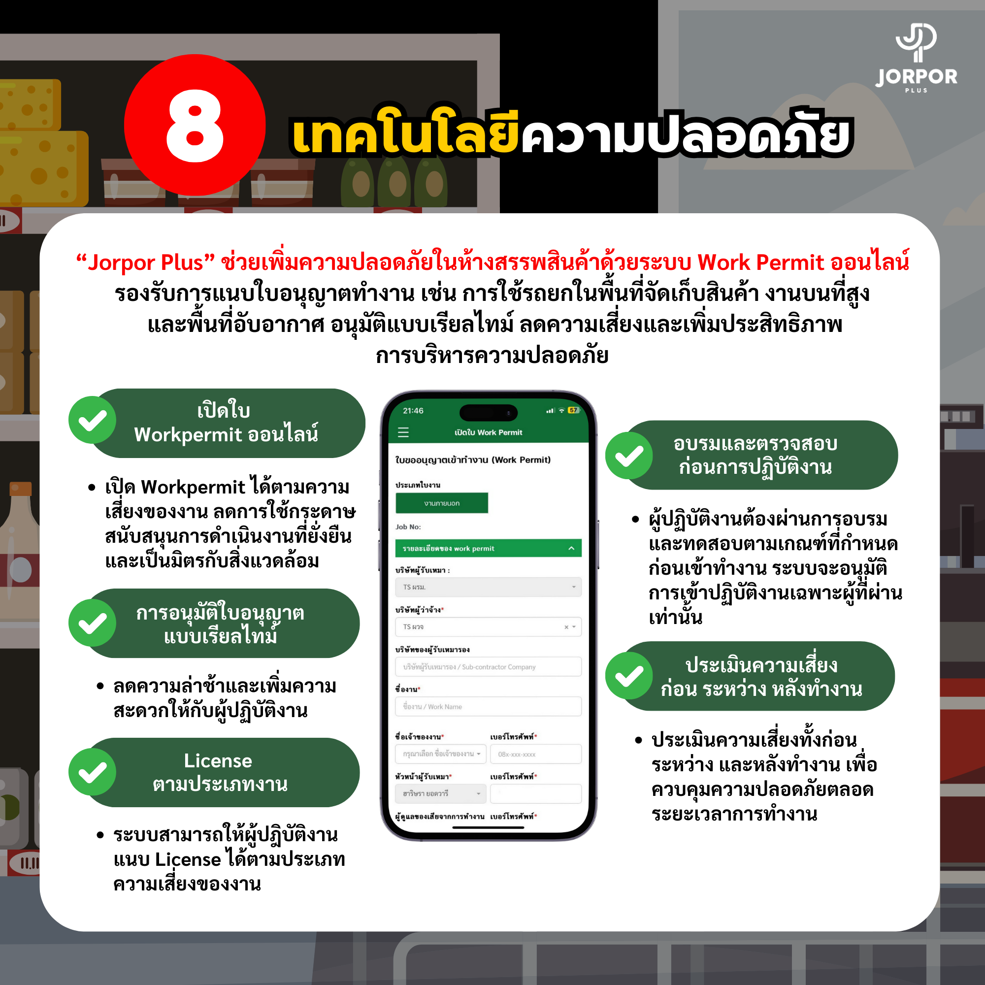 ห้างสรรพสินค้า ต้องมีมาตรการด้านความปลอดภัยที่รัดกุม ครอบคลุมทั้งอัคคีภัย โครงสร้าง สุขอนามัย และการรักษาความปลอดภัย โดยเฉพาะเมื่อต้องมีผู้รับเหมาเข้ามาดำเนินงานซ่อมแซมหรือปรับปรุงพื้นที่ Jorpor Plus ช่วยให้การจัดการด้านนี้เป็นเรื่องง่ายและมีประสิทธิภาพผ่าน ระบบจัดการใบอนุญาตเข้าทำงาน (EWS) ของ Jorpor Plus ผู้รับเหมา เจ้าของงาน และเจ้าหน้าที่ความปลอดภัย (จป.) สามารถเปิด Work Permit แบบออนไลน์และตรวจสอบสถานะการอนุมัติใบอนุญาตได้แบบเรียลไทม์ ลดความล่าช้าในการขออนุมัติ ก่อนเริ่มงาน ผู้รับเหมาสามารถ อบรมความปลอดภัยออนไลน์ได้ทุกที่ ทุกเวลา ทำให้มั่นใจว่าทุกคนที่เข้ามาทำงานในพื้นที่ได้รับความรู้ด้านความปลอดภัยที่จำเป็น